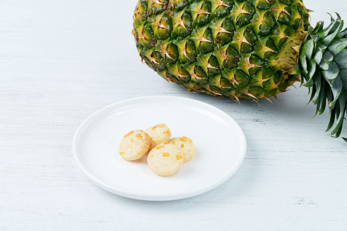 じっくりと低温で仕上げた自家製セミドライバナナ、苺、パイン 3種の果実の豊かな香りと甘みを閉じ込め、口の中でほどけるような軽やかな食感のクッキーに焼き上げました。