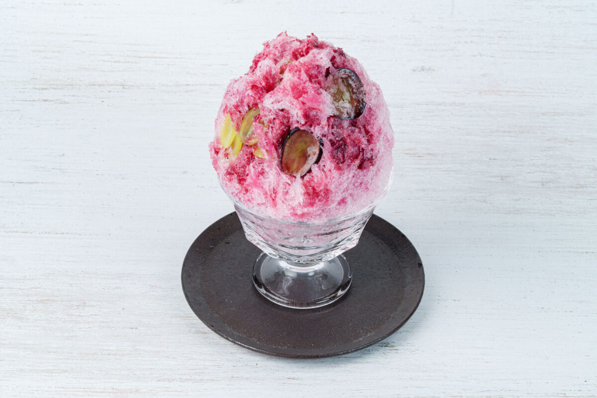巨峰を皮ごと使用しソースを炊き上げ、フレッシュのぶどうピューレで調合した贅沢な特製シロップとシャインマスカットやナガノパープル等の数種のぶどうスライスを、日光の天然氷蔵元「四代目徳次郎」から仕入れた綿雪のようなくちどけが特徴の氷に合わせて仕上げました。